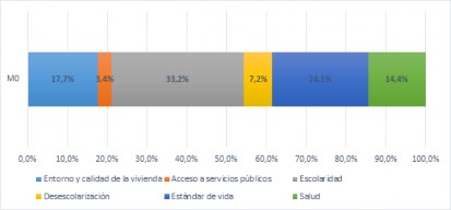 De acuerdo con los resultados de la medición de pobreza multidimensional de Medellín en 2014, la estructura de la pobreza muestra las dimensiones donde hay más porcentaje de personas privadas (ver Figura V). Así, la dimensión que contribuye en mayor proporción al total de la pobreza es escolaridad, con un porcentaje de 32,2%, seguida por estándar de vida con un porcentaje de 24,1%. Por su parte, las dimensiones que contribuyeron en menor medida a explicar el valor de M0, son: Acceso a servicios públicos y desescolarización con porcentajes de 3,4% y 7,2% respectivamente.