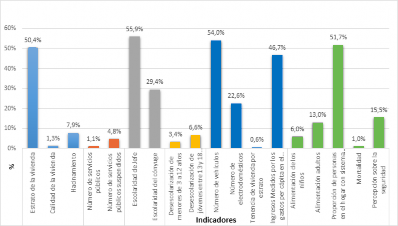 La dimensión que contribuye en mayor proporción al total de la pobreza es escolarización, con un porcentaje de 32,2%, seguida por estándar de vida con un porcentaje de 24,1%. Por su parte, las dimensiones que contribuyeron en menor medida al total de la pobreza son acceso a servicios públicos y desescolarización con porcentajes de 3,4% y 7,2% respectivamente. En concordancia con lo anterior, al analizar los indicadores se evidencia que, la escolaridad del jefe del hogar concentra el mayor porcentaje de privación, seguido por los hogares que no tienen vehículo particular, mientras que es bajo el porcentaje de hogares que se encuentran privados por tenencia de vivienda y número de servicios públicos. Las dimensiones y sus indicadores relacionados entregan evidencia a la política pública de la ciudad para actuar en aquellas donde la población se encuentra con mayores privaciones, tanto por extensión como intensidad.