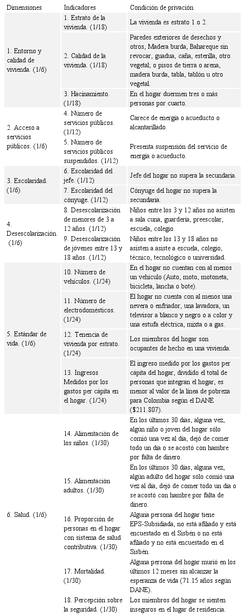 La medición del índice inicia con la etapa de identificación de la pobreza a nivel de hogar. Posteriormente, se definen 6 dimensiones de igual ponderación que reúnen 18 indicadores, entre los cuales se distribuye en partes iguales el peso de la dimensión a la cual pertenecen, tal como se muestra en la Tabla 1.