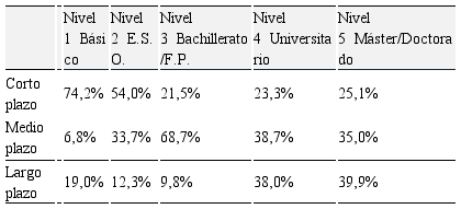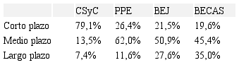 De las distintas iniciativas de actuación, consideran que la iniciativa CSyC es una solución a corto plazo, las PPE y BEJ a medio plazo y las BECAS a medio-largo plazo como se muestra en la Tabla 8. Datos coherentes con la influencia del nivel formativo en el impacto del programa (Tabla 9), que muestra claramente que en el corto plazo poseer un nivel básico tiene un efecto directo sobre el programa y a mayor nivel formativo el efecto es más relativo.