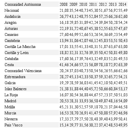 Instituto Nacional Estadísticas de España – INE (2008-2014). Encuesta de Población Activa (EPA). Recuperado de https://www.ine.es/infografias/tasasepa/desktop/tasas.html?t=0&lang=es