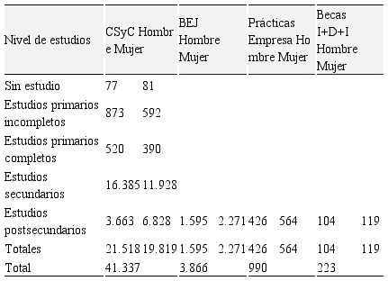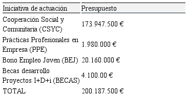 En la Tabla 2 se muestra el presupuesto de cuatro iniciativas de actuación diferenciadas pioneras en el territorio nacional, que deben ser analizadas y evaluadas con el fin de determinar si la administración atiende a las dificultades y necesidades de los jóvenes desempleados y si lo hace según los requerimientos del entorno competitivo actual, que permita sacar conclusiones y plantear alternativas así como propuestas de mejora para futuros programas.