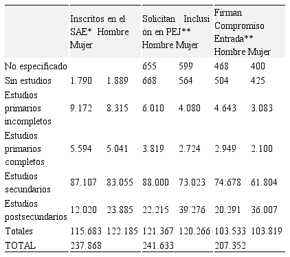 Así, en la Tabla 3, se puede observar el número de jóvenes por nivel de estudios inscritos en el Servicio Andaluz de Empleo a fecha 31 de marzo de 2014 (fecha fijada por el decreto para poder participar en la iniciativa Cooperación Social y Comunitaria), número de jóvenes que solicitaron su inclusión en el mismo y, finalmente, número de jóvenes que firman el compromiso de entrada (requisito imprescindible para participar en las iniciativas del Programa Emple@Joven).