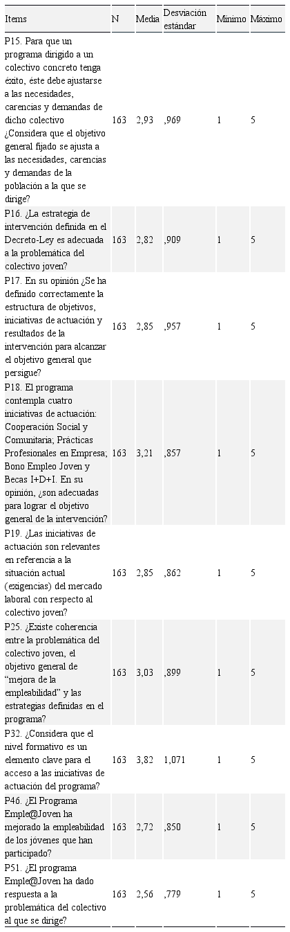 Analizando los datos anteriores se puede evidenciar que los encuestados no tienen mucha confianza en el programa de empleo. Así indican que existe poca coherencia entre la problemática del colectivo joven y las estrategias definidas (3,03), que las iniciativas son poco adecuadas para conseguir el objetivo general del programa (3,21) y están algo más de acuerdo al considerar que el nivel formativo es un elemento clave en referencia a las iniciativas de actuación del programa (3,82), argumentando que los usuarios con mayor formación tienen acceso a casi todas las líneas de actuación, mientras que los que tienen poca formación sólo pueden acceder a la línea de Cooperación Social y Comunitaria.