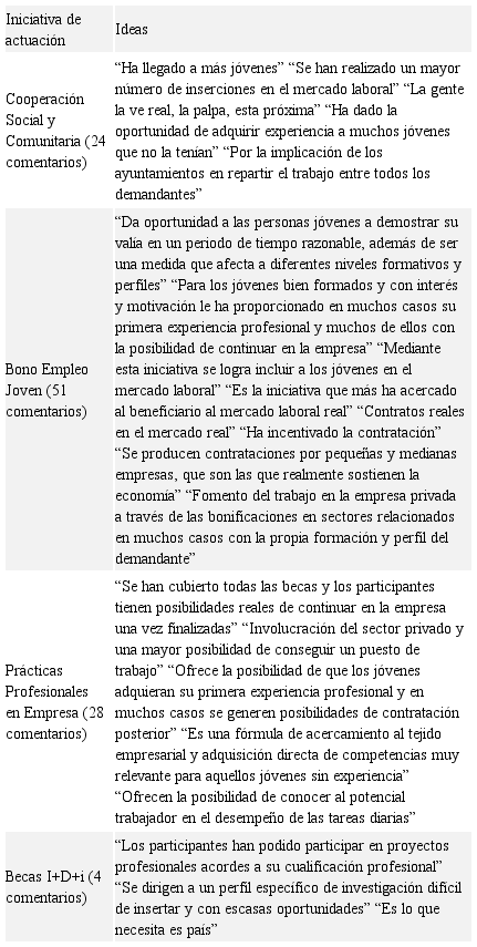 Datos que varían significativamente cuando se les pregunta sobre la iniciativa que consideran ha sido más eficaz, obteniendo el porcentaje más alto el Bono Empleo Joven para el 42,3% de los encuestados; seguido de Cooperación Social y Comunitaria con el 23,9%; Prácticas Profesionales en Empresa con el 22,1% y Becas I+D+I con el 3,7%; destacando el 8% que indica que ninguna de las iniciativas puestas en marcha ha sido eficaz. En cuanto al por qué consideran que ha sido la iniciativa más eficaz, en la Tabla 6 se muestran las principales ideas extraídas de las respuestas de los encuestados a la pregunta abierta incluida en el cuestionario.
