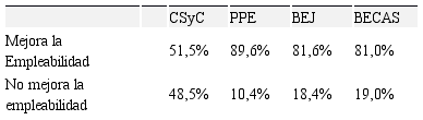 Al preguntar sobre las iniciativas que realmente mejoran la empleabilidad (Tabla 7), se observa claramente que la iniciativa Cooperación Social y Comunitaria (CSyC) según los encuestados, es la que menos mejora la empleabilidad de los participantes, destacando las Prácticas Profesionales en Empresa (PPE), Bono Empleo Joven (BEJ) y las Becas I+D+i (BECAS).