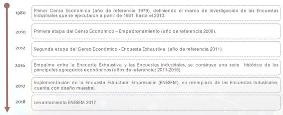 Hasta el término del año 2009 no se tenía un claro panorama de las empresas y su característica de negocio en el país, es por eso que para el 2010 el INEC realizó el Censo Nacional Económico (CENEC), esta base de información, fue insumo principal para la creación de la línea base del sector económico del Ecuador, fue realizado en dos etapas que se explica cronológicamente para una correcta interpretación. La primera consistió en el empadronamiento a fin de ubicar geográficamente a los establecimientos del universo y contar con un directorio actualizado; la segunda consistió en el levantamiento de la Encuesta Exhaustiva con año de referencia 2011, periodo para el cual no se realizaron las Encuestas Industriales.