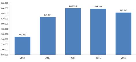 En ese sentido, se excluyen aquellas empresas que únicamente registraron información de ventas en el SRI o solo declararon personal afilado al IESS o únicamente presentaron su declaración al RISE durante el período 2011-2016. Por lo tanto, se puede observar en la Figura IV que existen 843.745 empresas en el año 2016 que comprenden unidades económicas que registraron alguna de las siguientes condiciones: 1) Ventas en el SRI, 2) Personal afiliado en el IESS, 3) Perteneciendo al RISE pagaron impuestos sobre sus ingresos en el SRI.