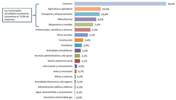 Al respecto, dentro de las cinco principales actividades económicas se concentran el 73% de las empresas en el año 2016, siendo el sector comercio el que mayor participación presenta con un 36,6%, seguido de Agricultura y ganadería (10,4%) así como Transporte y almacenamiento (10%). Por lo cual se está de acuerdo con Gutiérrez, Romero, Díaz y Sulbarán (2017) que: “La empresa familiar es un tipo de organización que cada día cobra mayor preeminencia, su sustancial contribución en la generación de producto, empleo e ingreso la convierte en pilar de progreso y bienestar” (p.99).