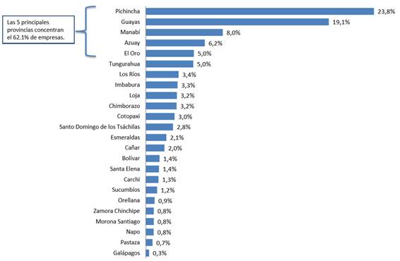 En cuanto a la distribución de estas empresas a nivel de actividades por provincia, las que más registros tienen son: Pichincha, Guayas, Manabí, Azuay y El Oro, que concentran el mayor número de éstas con el 62,1% en conjunto, tal como se muestra en la Figura VI. A nivel nacional el número de empresas por cada 10 mil habitantes alcanza las 510 empresas.