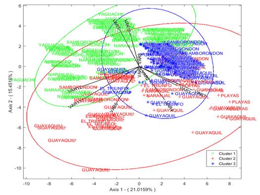 Por otro lado, en relación a los elementos que significativamente contribuyen a la sucesión en la empresa familiar, correspondiente a la fase 2, la lectura del gráfico de Biplot, mostrado en la Figura VIII, siguiendo a Calderón-Cisneros, et al. (2018) y Calderón, Ortiz, Alcívar, Espinoza y Vicente (2019), se tienen tres tipos de clúster, los cuales se definen de la siguiente manera: La familia, que relaciona los valores, actitudes y la relación intrafamiliar, en primero, segundo y hasta tercer grado de consanguinidad (cluster1); la propiedad, donde se consideran temas como: La estructura de poder y la correcta administración del patrimonio así como el modelo de negocio, es decir, los productos y servicios que ofrecen; también la gestión, referida a la administración del recurso humano y tecnológico (cluster2); y en lo referente a la sucesión, donde se trata de garantizar la continuidad de la empresa y de la familia empresarial (cluster3).