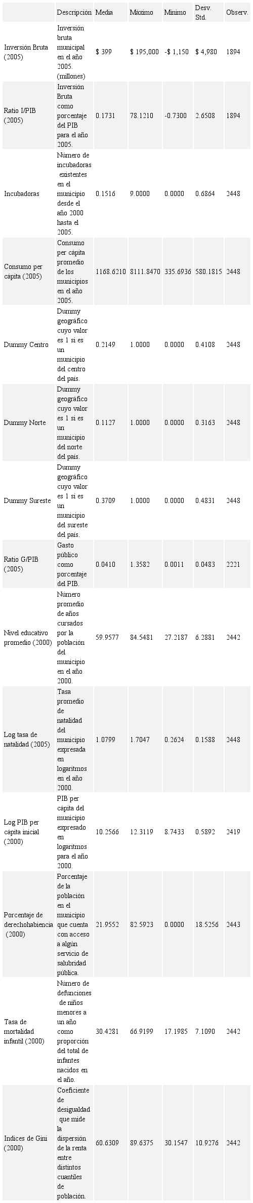 La Tabla 1, presenta los estadísticos descriptivos de las principales variables empleadas en este estudio, así como su descripción, origen y períodos de tiempo que capturan. La mayor parte de la base de datos, en especial las variables de índole económico y social, se obtienen del Instituto Nacional de Estadística e Informática (INEGI) y del Programa de las Naciones Unidas para el Desarrollo (PNUD), en su capítulo de México. La variable más importante de este estudio, que mide el número de incubadoras de negocios en los municipios mexicanos, se obtuvo del Sistema Nacional de Incubadoras de Empresas (SNIE, 2010). La variable dependiente es la tasa de crecimiento del PIB per cápita para el período 1999-2009, medidos en dólares y calculado en base a datos del PNUD y del INEGI.