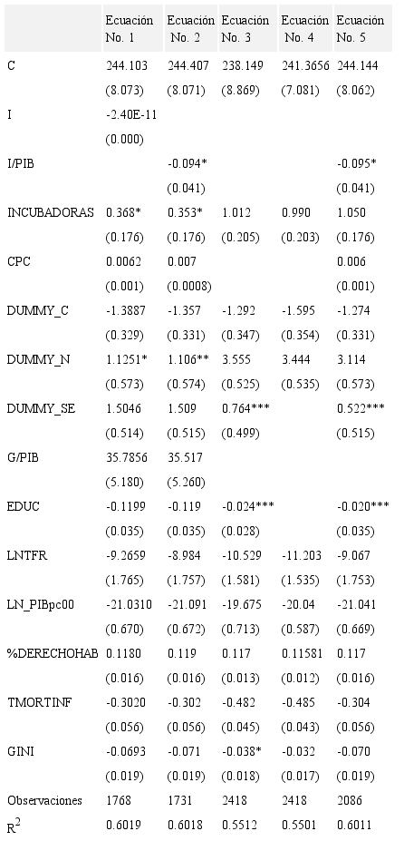 Adicionalmente, se incluyen otras variables de índole socioeconómico como la tasa de participación educativa en el municipio (EDUC), la tasa global de fecundidad (también en el municipio) expresada en logaritmos, el porcentaje de población con derechohabiencia a algún servicio de salud (%DERECHOHAB), la tasa de mortalidad infantil municipal (TMORTINF), y el valor del coeficiente de Gini del municipio, que sirve para controlar por los niveles de desigualdad en el ingreso. La variable de interés es la que identifica el número de incubadoras en los municipios del país (INCUBADORAS). Finalmente, se incluyen tres variables dummy de índole geográfico (DUMMY N, DUMMY C y DUMMY SE), con la intención de controlar por elementos específicos de esas regiones (norte, centro y sureste) del país.