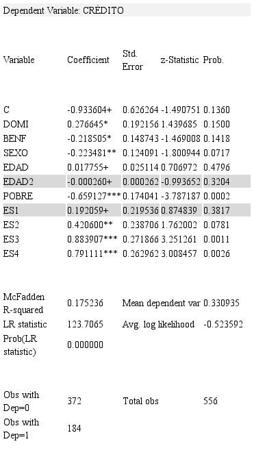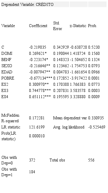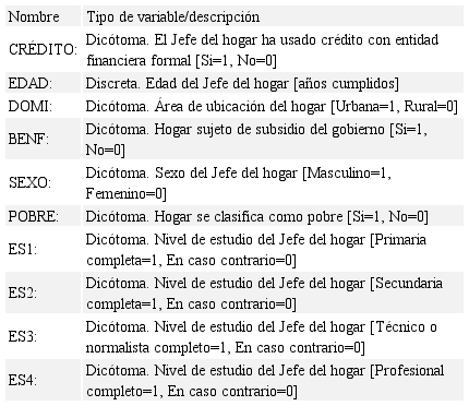 La variable dependiente es: Y=Crédito (si tiene acceso al crédito en entidad financiera formal), que es la variable explicada, la cual toma el valor 1 si se trata de un hogar con inclusión financiera, a través del crédito por parte de entidad financiera formal y 0 en caso contrario. Las variables explicativas que se incorporan, se muestran en la Tabla 1 y corresponden a algunas características de los hogares (socioeconómicas) y del jefe del hogar. Así las cosas, se tiene que: Variable explicada: CRÉDITO y Variables explicativas: EDAD, DOMI, BENF, SEXO, POBRE, ES1, ES2, ES3, ES4.