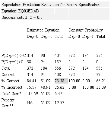 d. Se confirma la bondad del ajuste con los resultados de Eviews7.1 en relación con los valores de Cuenta R. (Tabla IV), que registra el número de predicciones correctas en relación con el número total de observaciones, que es de 73,38%.
