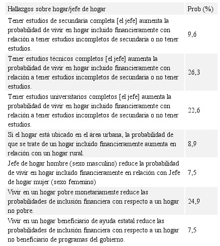 Los factores que inciden de manera directa en el fenómeno de la inclusión financiera, son los años de escolaridad, representados en este caso en títulos alcanzados a partir del bachillerato. Por su parte, la pobreza monetaria es un factor explicativo clave, que reduce de manera significativa las probabilidades de que los jefes de hogar sean considerados como incluidos financieramente. De ahí la necesidad de que en el campo económico se continúen con los estudios sobre la pobreza y sus consecuencias, a los cuales deberían dársele prioridad sobre otros que no necesariamente impactan en el bienestar de la gente. Igualmente, si el hogar se caracteriza por estar ubicado en el área rural o es sujeto de ayuda estatal directa, reduce las probabilidades de inclusión financiera. Caso similar ocurre si el jefe de Hogar es de sexo masculino.