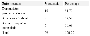 En relación a las patologías o enfermedades asociadas al maltrato por omisión, se observa en la Tabla 9: 15 casos (51,72%) con desnutrición proteico-calórica, 8 casos (27,58%) con amibiasis intestinal y 6 (20,68%) presentaron asma bronquial, lo cual guarda similitud con los resultados obtenidos por Widom, Czaja, Bentley y Johnson (2012), quienes establecieron que el maltrato por omisión es un factor que aumenta el riesgo de diabetes, enfermedades pulmonares y desnutrición, causada por el abandono familiar (Barroso, Salvador y Fagundes, 2016), además existe un aumento de la prevalencia de desnutrición crónica en niños menores de cinco años, en hogares donde existe violencia contra la mujer y negligencia (Ruiz-Grosso, Loret y Miranda, 2014).