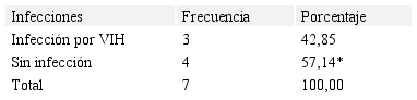 De igual manera, en la Tabla 10 se puede observar que de los 7 casos de abuso sexual que se encontraron en la investigación, 3 casos (42,85%) presentaron infección por VIH y 4 (57,14%) resultaron sin infección de trasmisión sexual, con una diferencia significativa (p<0.01); mientras que en Chile la prevalencia de abuso sexual fue de 5 y 11% (Silva y Widoycovich, 2011).