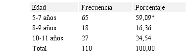 En la Tabla 1, de acuerdo con la edad de los niños y niñas víctimas de maltrato infantil, de los 110 niños, el 59,09% (65) tenían entre cinco y siete años, un 16,36% (18) con edad de ocho a nueve años y otro 24,54% (27) entre diez y once años. El promedio de la población estudiada es de 8 años de edad, con una diferencia significativa (p<0.01) en el grupo de cinco y siete años, en forma similar según Benavides y León (2013), en Perú se registra el maltrato infantil entre los 6 y 11 años de edad, porque los padres o encargados del cuidado de los niños consideran el uso de la violencia como una forma de disciplinar y corregir. En la investigación realizada por Chang, et al. (2016) sobre el abuso infantil, la incidencia fue mayor en los niños menores de 6 años, por ser vigorosos y curiosos, lo que desencadena frecuentemente la ira del cuidador.