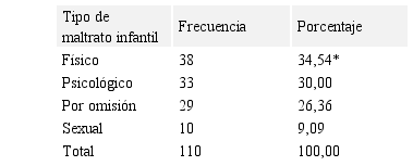De igual manera en la Tabla 3, en relación a la distribución según los tipos de maltrato infantil, se observó que un 34,54% (38) era físico, 30% (33) psicológico, en tanto que por omisión se encontró un 26,36% (29) y sexual 9,09% (10), con una diferencia significativa (p<0.01) en el maltrato físico, de forma similar al trabajo de Fernández, Arráiz y Paredes (2008) en el estado Zulia, Venezuela, en el cual los padres reconocieron utilizar como solución a los problemas familiares la violencia física.