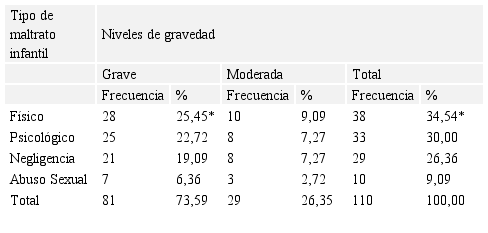 Asimismo, en la Tabla 4 se puede apreciar la distribución de acuerdo a los niveles de gravedad según el tipo de maltrato infantil, observándose que de los 110 niños que recibieron maltrato, 81 casos (73,59%) mostraron maltrato infantil grave y 29 casos (26,35%) moderado, predominando el maltrato físico con 25,45% (28 casos), con una diferencia significativa (p<0.01) en éste para el nivel grave y moderado. En forma similar los estudios a nivel mundial establecen un alto nivel de gravedad en el maltrato infantil, puesto que solo en el año 2002, 53.000 niños murieron asesinados, entre un 20 y un 65% sufren acoso entre pares, 150 millones de niñas y 73 millones de niños sufrieron violencia sexual (Gancedo, 2017; Czerwinski, Finne, Alfes y Kolip, 2018).