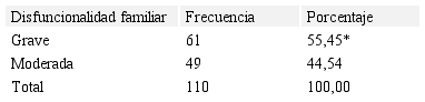 Por otro lado, con respecto al análisis de la funcionabilidad del grupo familiar, se evidenció en la Tabla 5 disfuncionalidad familiar grave en el 55,45% de los casos (61) y disfuncionalidad moderada en el 44,54% (49), con una diferencia significativa (p<0.01) en la disfuncionalidad familiar grave, siendo similar a la investigación realizada por Ambriz-Mora, Zonana-Nacach y Anzaldo-Campos (2015), en el cual las mujeres encuestadas tenían una familia altamente disfuncional, con una incapacidad de los miembros de estas para mantener una relación intrafamiliar basada en cuidados mutuos y buenos tratos.