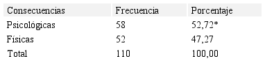 En cuanto a las consecuencias del maltrato infantil, se puede observar en la Tabla 6 que de acuerdo con los resultados, se encontró un 52,72% (58 casos) de consecuencias psicológicas y un 47,27% (52 casos) de secuelas físicas, con una diferencia significativa (p<0.01) en las psicológicas. La exposición a la violencia familiar constituye un grave riesgo para el bienestar psicológico de los menores, especialmente si, además de ser testigos, también han sido víctimas de ella, como lo afirman Pernebo y Almqvist (2017).