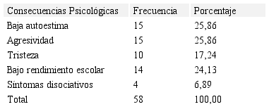 Asimismo, en la Tabla 7, de los 58 niños y niñas con consecuencias psicológicas, se determinó: 15 casos (25,86%) con baja autoestima, 15 casos presentaron agresividad (25,86%), 10 casos tristeza (17,24), 14 casos (24,13%) con bajo rendimiento escolar y 4 casos (6,89%) con síntomas disociativos (alteraciones en la organización o la estructura del contenido mental de la identidad, la memoria, la percepción o la consciencia). En forma similar Vrijsen, et al. (2017), establecieron en su investigación que el maltrato infantil como una experiencia adversa, constituye un factor predisponente para depresión, ansiedad, estrés post-traumático, estrés crónico, baja autoestima, con graves efectos cognitivos, problemas conductuales en la escuela y el hogar.