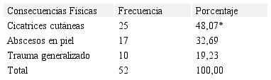 Por su parte, se puede apreciar en la Tabla 8, que de los 52 niños con consecuencias físicas de maltrato infantil, se determinó: 25 casos (48,07%) con cicatrices cutáneas, 17 casos (32,69%) con abscesos en piel (infección bacteriana que produce secreción amarilla conocida como pus), 10 casos (19,23%) con traumatismo generalizado, con una diferencia significativa (p<0.01) en cicatrices cutáneas, encontrando similitud con el trabajo realizado por Lee, et al. (2017), donde se evidenciaron lesiones agudas como traumatismo craneoencefálico y del sistema musculo esquelético. Es de resaltar, que según la UNICEF (2012), así como Kodner y Wetherton (2013), para el diagnóstico precoz de maltrato infantil, se deben tomar en cuenta la presencia de lesiones residuales tipo cicatrices y las infecciones de las heridas postraumáticas.