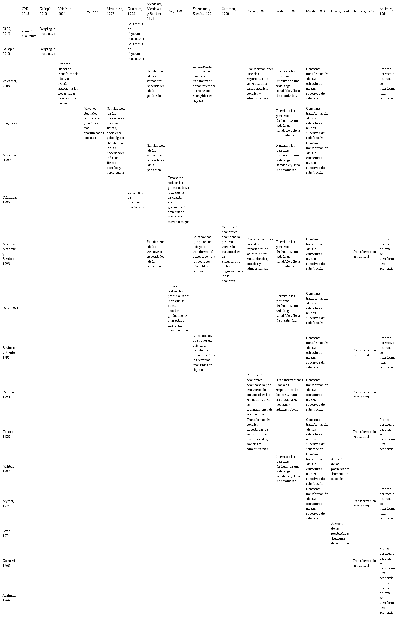 Ahora bien, se ha realizado una búsqueda de los autores, organismos y estudiosos para conocer los puntos resaltantes del concepto desarrollo. En relación con las contribuciones de dieciséis autores y de sus correspondientes definiciones, se ha elaborado el siguiente Cuadro 1, que resume los principales aspectos conceptuales referidos al desarrollo económico, seleccionados en la revisión bibliográfica concluida.
