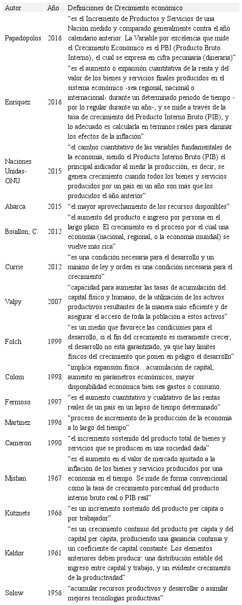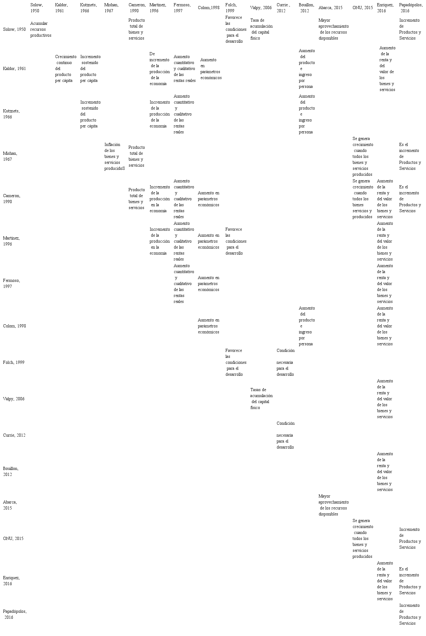 Como se ha expuesto, existe una amplia bibliografía, en la cual se destacan los factores cuantitativos que subyacen en el concepto de crecimiento económico. En este sentido, cualquier ejercicio de análisis debe partir de una exposición amplia del término estudiado. En el Cuadro 3, se exponen dieciséis definiciones de “crecimiento económico”, con el objetivo de conocer si éste es un fenómeno autónomo, es decir, si solo puede ser analizado de manera satisfactoria en términos puramente económicos.