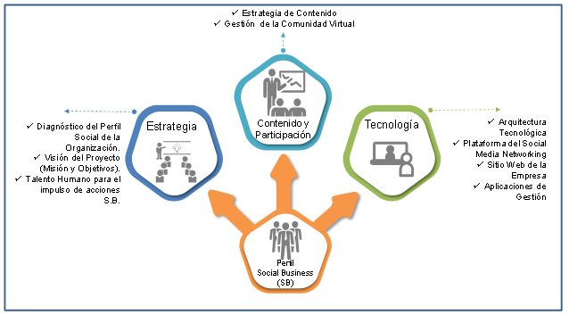 Ahora bien, para efectos de este trabajo se consideran como elementos que configuran el Perfil Social Business para el marketing de empresas de intermediación turística (específicamente agencias de viaje ubicadas en la Península de Paraguaná – estado Falcón, Venezuela), los aspectos señalados por Ibermatica Digital (2014) como pilares para la adopción del SB, es decir: Estrategia SB, contenido y tecnología. Estos recogen de manera general los componentes que debe incluir una organización que se alinea con este tipo de propuesta estratégica.