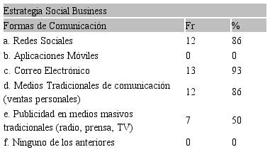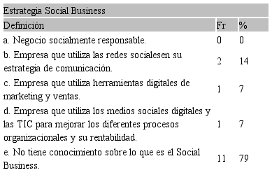 Por otra parte, para el 7% de las empresas, el Social Business es una forma de gestión empresarial que utiliza herramientas digitales de marketing/ventas. No obstante, 7% considera que esta estrategia hace uso de los medios sociales digitales y las TIC, para mejorar los diferentes procesos organizacionales y la rentabilidad económica de la organización (ver Tabla 1), lo cual de manera general es el verdadero fin que persigue la estrategia de Social Business.