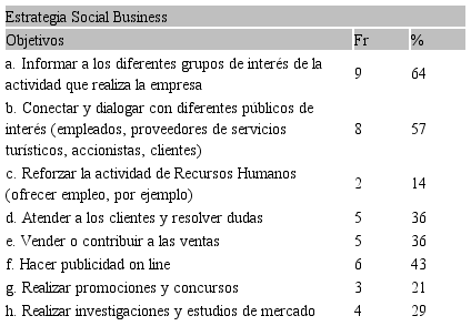 Ahora, en relación de los objetivos que se consiguiesen a través de la implementación de la estrategia de Social Business, el 64% de los entrevistados considera que es informar a los diferentes grupos de interés, acerca de la actividad que realiza la empresa, el 57% manifiesta que el objetivo sería conectar y dialogar con diferentes públicos de interés (empleados, proveedores de servicios turísticos, socios, clientes), el 43% opina que el propósito de esta novedosa estrategia empresarial es hacer publicidad on line; sin embargo, para el 36% de los gerentes las intenciones de esta estrategia serían atender a los clientes, resolver dudas y vender o contribuir con las ventas del negocio, es decir, llevar adelante la gestión de marketing, tal como se aprecia en la Tabla 2.