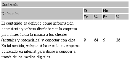 En tal sentido, cuando se consultó a los gerentes si su empresa ha creado contenido en internet para darse a conocer a través de los medios digitales, se puede observar en la Tabla 4, que el 64% indicó de manera positiva a tal interrogante. Sin embargo, el 36% de los entrevistados señaló no haber diseñado contenido de carácter digital para interactuar con sus clientes.