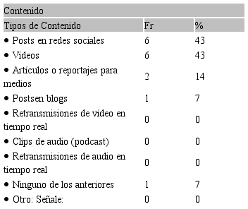 El contenido presenta diferentes formas o tipos, como videos, juegos, manuales de instrucciones, blogs, breves comentarios, opiniones de expertos e incluso eventos físicos. Ahora bien, en referencia a los tipos de contenido que utilizan las empresas en estudio que hacen uso de esta herramienta comunicacional, se evidencia según los datos presentados en la Tabla 5, que lo más empleado por estas organizaciones son los Posts en redes sociales (43%), los videos (43%) y los reportajes o artículos para medios (14%).