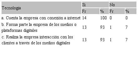 Para la conformación de un entorno social que sirva de plataforma a la estrategia empresarial Social Business, se requiere de un conjunto de elementos de carácter tecnológico, que permitan la interacción efectiva y dinámica con los diferentes grupos de interés. En tal sentido, se presenta en la Tabla 6 información referente a las condiciones básicas, que desde el punto de vista tecnológico poseen las empresas en estudio, para la implementación de estrategias de marketing sobre la base del uso de los medios digitales.