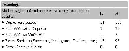Ahora bien, en relación a los medios digitales con los cuales se realiza la interacción de la empresa con los clientes, se destaca de los datos presentados en la Tabla 7, que el correo electrónico es el medio utilizado por el 100% de las organizaciones de intermediación turística, para establecer relaciones con los clientes, el 93% hace uso de las redes sociales digitales, con la finalidad de generar procesos de marketing y sólo el 21% utiliza el sitio web de la empresa, para interactuar con los clientes. Entendiendo que de acuerdo a lo planteado por García-Álvarez (2013), los portales corporativos (sitios web) son herramientas globales que permiten el acceso instantáneo y organizado a la información de la empresa mediante diversas aplicaciones.
