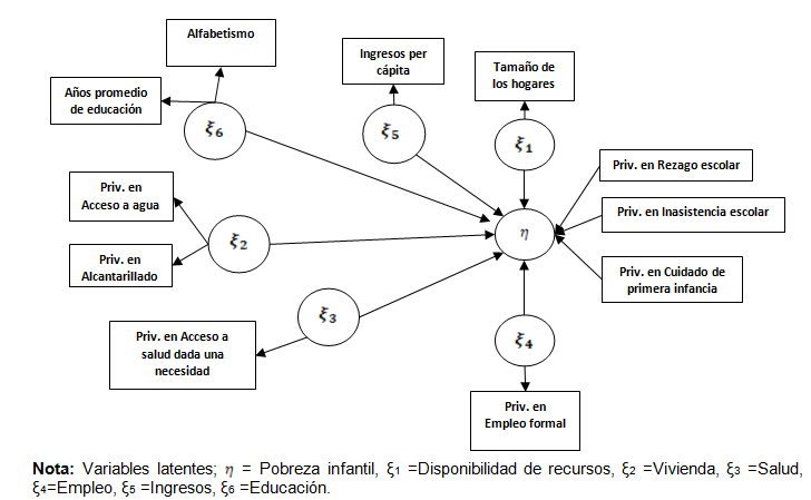 El concepto multidimensional de la pobreza y la interdependencia con los factores que inciden sobre ésta, han cuestionado la forma de combinar todos estos elementos para analizar este fenómeno (Di Tommaso, 2007). En el presente escrito, se plantea la construcción del indicador de pobreza infantil, evaluando endógenamente los determinantes que inciden sobre esta variable. El método empleado teoriza ciertos conceptos abstractos (entre ellos la pobreza) y los engrana en un sistema de ecuaciones para observar sus relaciones de causalidad. Estos conceptos son construidos mediante un número de indicadores que sintetizan la variable teorizada. Una vez construidos estos se pueden relacionar como en un modelo de regresión múltiple (Bollen, 1989).