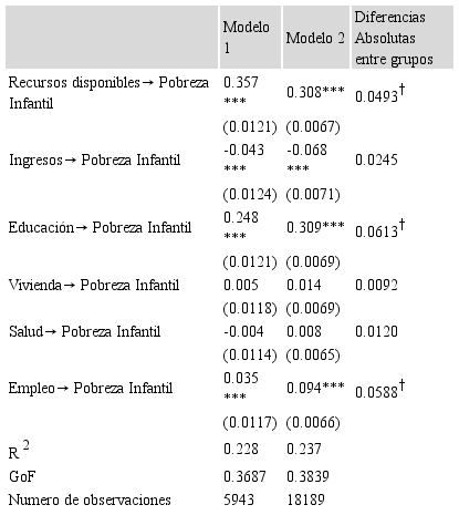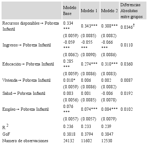 Una vez validado el modelo se pueden analizar los resultados expresados en los coeficientes de ruta, los cuales muestran las relaciones entre las variables latentes. En la Tabla 6, se realizan las estimaciones para el modelo presentado en la Figura I mediante un modelo PLS-PM. En primer lugar, en la columna dos se muestran las estimaciones para el total de individuos (modelo base). Como se puede observar, en los hogares con mayores recursos disponibles (visto desde el tamaño de los hogares, en el que se presume que a mayor tamaño de los hogares menos recursos disponibles para distribuir entre los niños del hogar), disminuye la pobreza infantil (su coeficiente es altamente significativo y con el signo esperado). Los ingresos promedio del hogar también inciden positivamente en la reducción de este fenómeno, luego hogares con mayores ingresos reducen la pobreza infantil.
