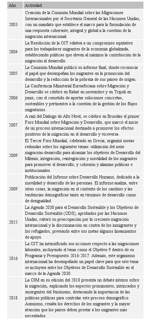 En la siguiente Tabla 1, se presentan algunas propuestas auspiciadas por organismos internacionales abocadas a tratar el tema de la migración, el empleo y el desarrollo, que a juicio de la Oficina Internacional del Trabajo (2017), son problemas que se han agravado debido a grandes movimientos de refugiados, personas desplazadas por la fuerza y migrantes en situación irregular, en distintas partes del mundo, que abren la oportunidad de un amplio debate político por autoridades gubernamentales, pues no puede ocultarse el hecho de que muchas personas migran con la esperanza de una estabilidad económica y social para ellos y sus familiares.