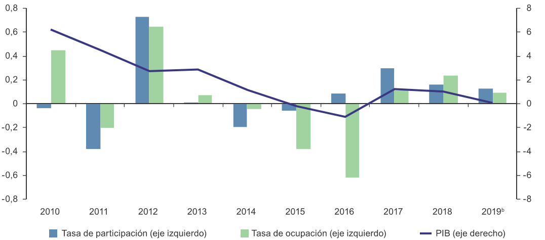 Asimismo, se asocia la informalidad “con la pobreza, también se reconoce como una barrera para el crecimiento económico por sus efectos negativos sobre las condiciones de trabajo, la productividad y la financiación del Sistema de Protección Social” (Moreno y Tamayo, 2012, p.8). Así, según la Comisión Económica para América Latina y el Caribe (CEPAL) y la Organización Internacional del Trabajo (OIT) (CEPAL/OIT, 2020) “el trabajo informal es la fuente de ingresos de muchos hogares de América Latina y el Caribe, donde la tasa media de informalidad es de aproximadamente un 54%, de acuerdo con estimaciones recientes de la OIT” (p.9). Además, a pesar de existir una recuperación de la tasa de ocupación en el año 2017 y 2018, se puede observar en el Gráfico I, una reducción para el año 2019, que se caracteriza por un bajo crecimiento económico de los países y también una escasa generación de empleo, donde la tasa de ocupación se incrementó en un 0,2% en promedio.