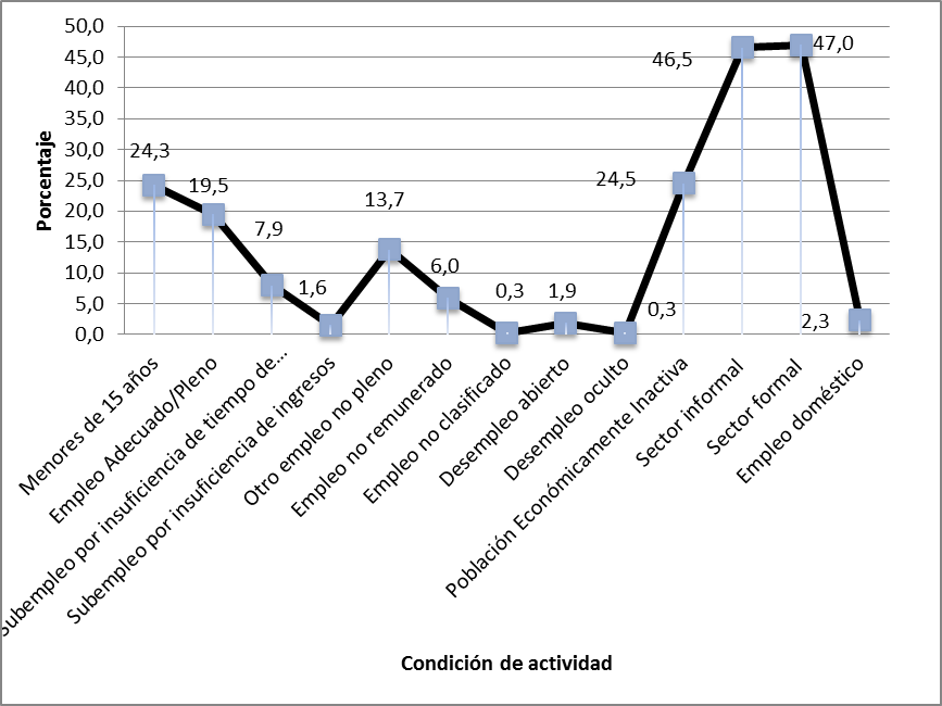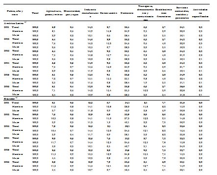 En Ecuador el comercio es una actividad formal, que representa el 32,2% superior al 26,8% con relación a América Latina, siendo la mayor actividad desarrollada por la población económicamente activa de género femenino, que representa el 42,4% con respecto a los varones que alcanza el 25%, seguido por las actividades relacionada con los servicios, como se puede observar en la Tabla 2. Sin embargo, el comercio es desarrollado no solo como una actividad formal, sino también informal, considerándose como un síntoma a nivel mundial, y un fenómeno complejo y de múltiples dimensiones que comprende varios aspectos como: Sociales, económicos, históricos y formativos.