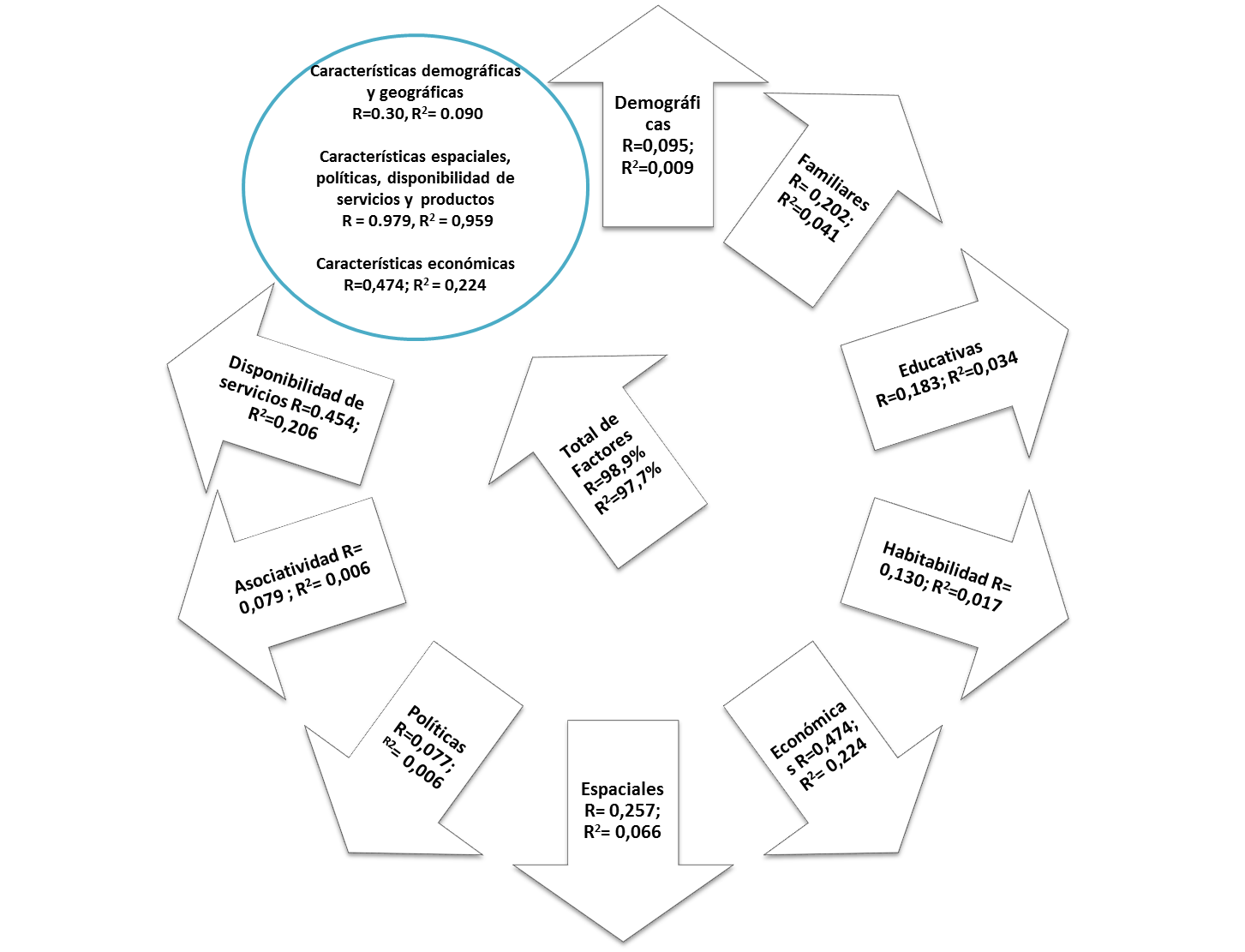 En ese sentido, el análisis factorial permitió reducir en 9 componentes agrupados por características de asociatividad, demográficas, educativas, familiares, habitabilidad, económicas, espaciales, políticas y de disponibilidad de servicios básicos; como se muestra en el Cuadro 4.