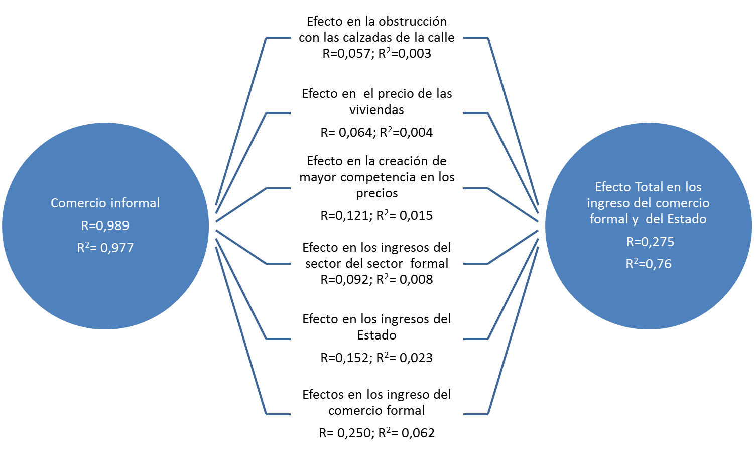 Finalmente, el comercio informal tiene un efecto en la obstrucción de las calzadas de la calle, precio de viviendas, creación de mayor competencia de precios de los productos, ingresos del sector formal, ingresos del Estado por evasión tributaria, así como en los ingresos del comercio formal.