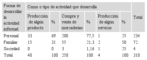 La actividad comercial que se desarrolla por los comerciantes informales según los resultados de la investigación, son de tres tipos: Aquellos que se dedican a la producción de algún producto en un 15,5%, a la compra y venta de mercaderías en un 83,2% y a la producción de algún servicio en un 1,3%. Cuando estas variables son cruzadas con la forma de desarrollar la actividad informal, los resultados muestran, que una persona que se dedica al comercio informal de forma personal, lo realiza a través de la compra y venta de mercaderías en un 77,5%, de tipo familiar en un 21,3% y en sociedad el 1,16%, como se puede observar en la Tabla 6.