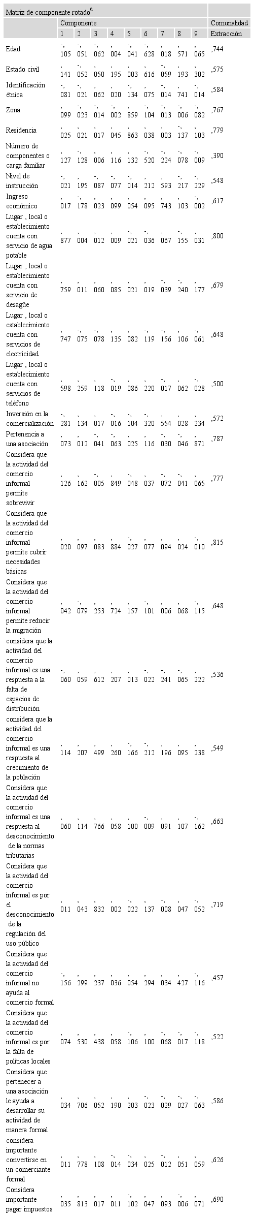 A fin de identificar qué factores son las causas más importantes que explican la actividad del comercio informal en ciudades intermedias, se aplica el modelo factorial, considerando un total de 26 variables para el análisis. Los resultados del análisis factorial, muestran que el índice de KMO es igual a (KMO=0,666) 66,6% y la prueba de Ballert menor a 0,05; lo que significa que el modelo es adecuado y que se puede aplicar el análisis factorial. La aplicación del modelo factorial, permite reducir de 26 variables a 9 variables que explican el 63,76% como se observa en la Tabla 7.