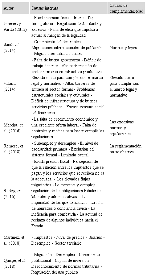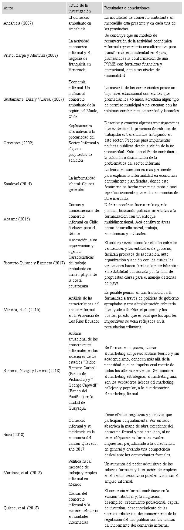 En los estudios realizados, se puede identificar investigaciones relacionadas con la identificación de características y causas sobre la actividad informal que se desarrollan en distintos territorios, como las de: Sandoval (2014), Moreira, et al. (2016); Adasme (2016); Romero (2018); Romero, et al. (2018); Boza (2018); Martínez, et al. (2018). También, sobre la medición de las variables que explican las causalidades de la informalidad y del comercio informal, de los autores: Jiménez y Martínez-Pardo (2013); Sandoval (2014); Villamil (2014); Rodríguez (2016); Moreira, et al. (2016); Romero, et al. (2018); Martínez, et al. (2018); igualmente acerca de la identificación de causas y su relación con la evasión tributaria, como la de Figueroa-Sierra, Ribet-Cuadot y Noda-Rodríguez (2012) y Quispe, et al. (2018).