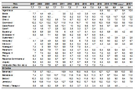 Sin embargo, la tasa de desocupación según la Organización Internacional del Trabajo (OIT), en los países de América Latina, alcanza en promedio para el año 2017 un 8,7%, siendo en Brasil más acentuada con un 13,1%, seguido por Jamaica (12,1%), Barbados (10,4%), entre los países por debajo de la medía se encuentran Guatemala (3,2%), México (3,5%) y Ecuador (4,3%); y para el año 2018, alcanza el 8,4% y de 8,5% en el 2019; en la mayoría de los países existe un incremento, como se presenta en la Tabla 1, según datos de la CEPAL/OIT (2020) y de la OIT (2018 y 2019).
