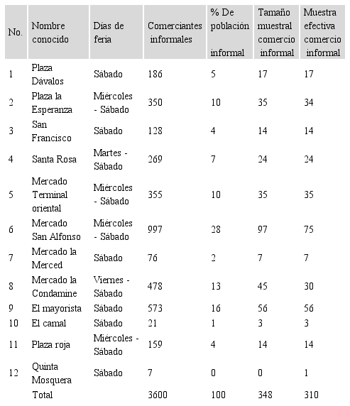 Se identifica que existe en total alrededor de 3.600 comerciantes informales que desarrollan el comercio informal al alrededor de los 12 mercados urbanos en la ciudad de Riobamba, distribuidos como se muestra en la Tabla 3, lo que constituye la población para la investigación. A su vez, se utilizó el muestreo no probabilístico intencionado, considerando que el elemento muestral cumpla la condición de comerciante informal, vendedor ambulante o sin puesto fijo, puesto que al tratarse de una investigación cualitativa no todos los sujetos tienen la misma probabilidad de formar parte de la muestra, sino que depende de los días de ferias de cada mercado.